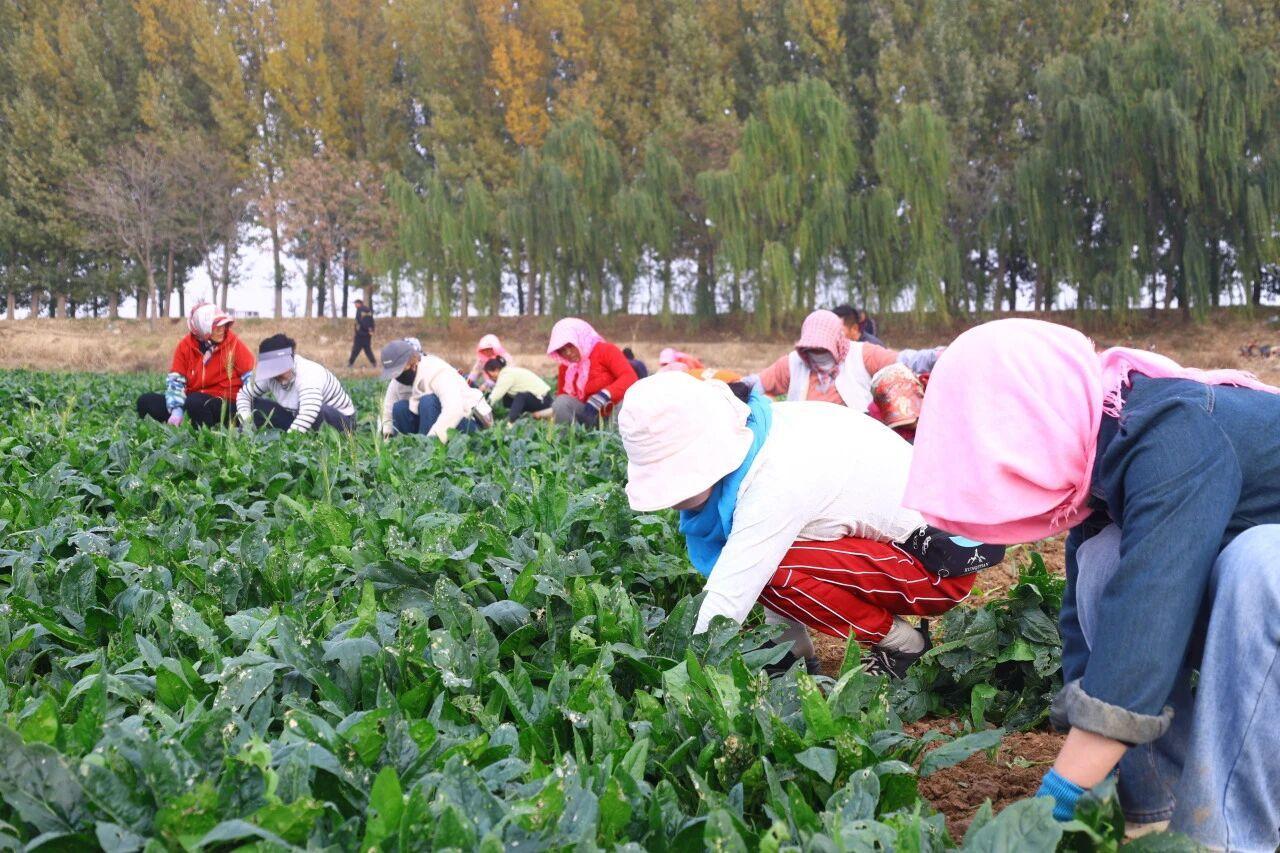 另一边的常信乡丁北村,阳光洒在田间,一片翠绿的菠菜正等待采收。村民们穿梭在菜畦间,采收、分拣、绑扎,动作行云流水,不一会儿就装满了筐。