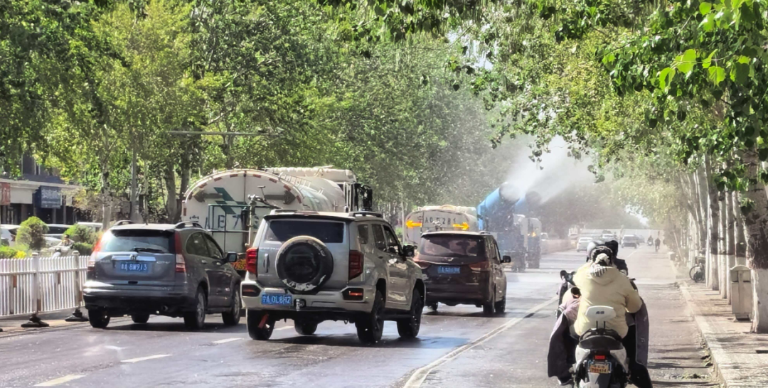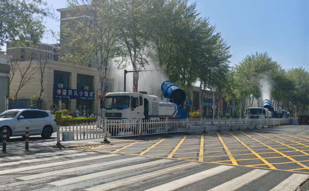 雾炮”精准出击,湿化飞絮促沉降。雾炮车是本次治理的“主力军”。贺兰县综合执法局每日出动多功能抑尘车,对县城道路两侧树木、绿化带进行喷雾作业,给附着的杨柳絮降温、“加湿”,让高处的杨柳絮短时间内集中掉落。雾炮喷出10150微米的细水雾,像“人工降雨”一样包裹空中飞絮,使其增重落地,有效减少空中飘浮量,在消除火灾隐患的同时,也为市民营造更加舒适的出行环境。