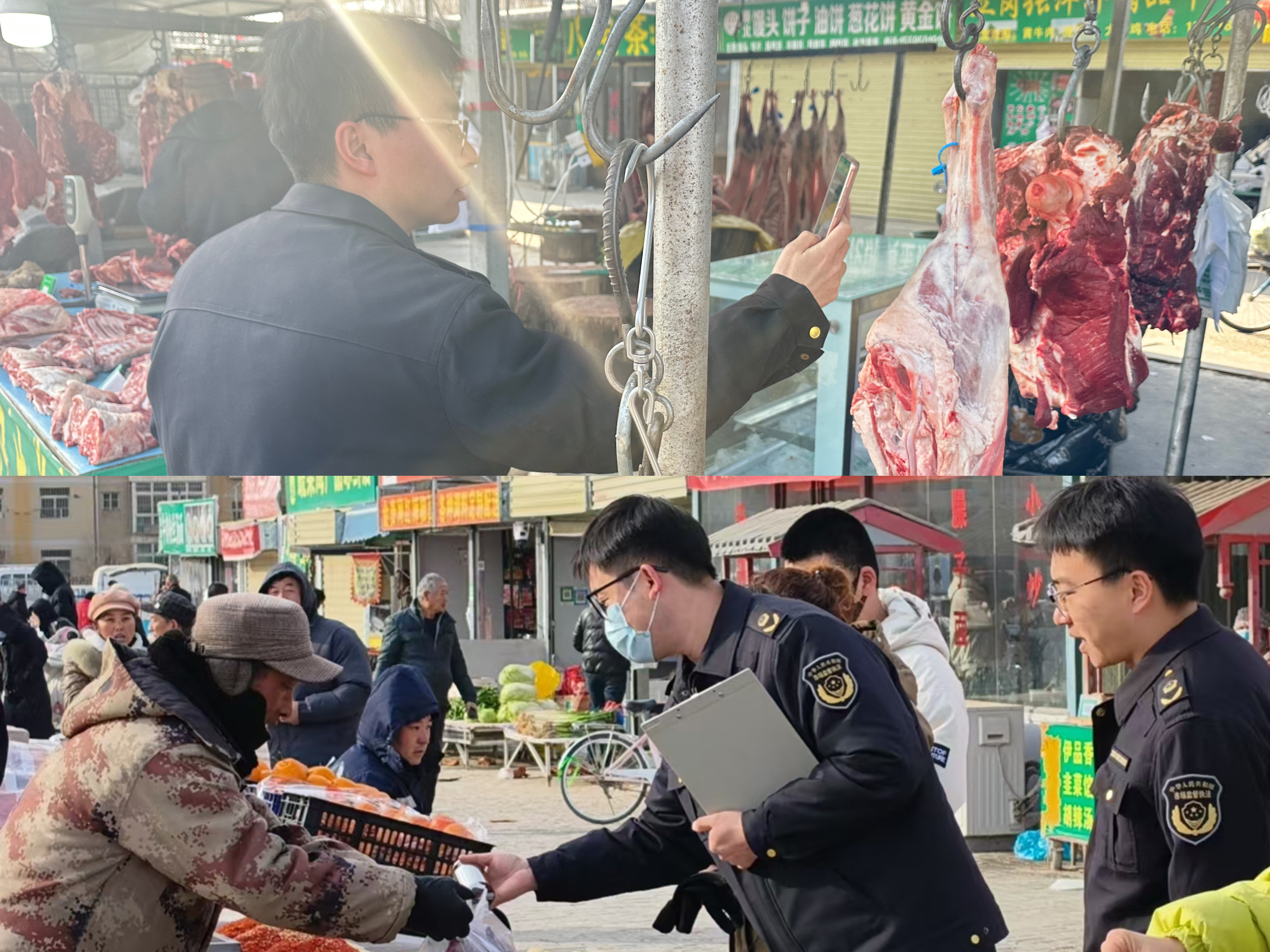 肉制品是每家年夜饭必不可少的一道“硬菜”。执法人员重点针对猪肉、牛肉、禽肉等摊位,进行了细致全面的检查,严格查验进货台账、索证索票凭证,确保来源可溯、质量可靠。重点检查“蓝环蓝章”(动物检疫合格证明、肉品品质检验合格证明、检疫验讫印章、肉品品质检验验讫印章)是否齐全。“我的肉你们随便检查。”肉摊老板热情地招呼执法人员进店检查。