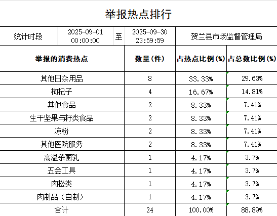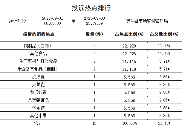 截至2025年9月30日,贺兰县市场监督管理局通过12315、12345、办公电话、微博、信函等途径共受理各类消费者投诉举报761件(其中投诉681件,举报68件,咨询建议求助11件,表扬1件),较上月增加20件,2024年9月共受理797件,同比下降4.51%。已办结579件,办结率76.08%,书信60件,微博0件。