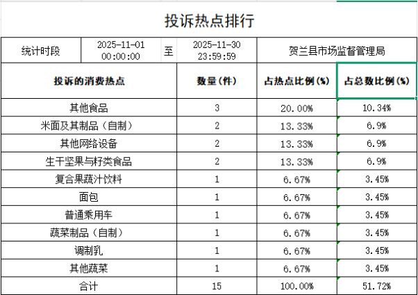 截至2025年11月30日,贺兰县市场监督管理局通过12315、12345、办公电话、微博、信函等途径共受理各类消费者投诉举报710件(其中投诉645件,举报55件,咨询建议求助10件,表扬0件),较上月减少20件,2024年11月共受理703件,同比上涨0.42%。已办结574件,办结率80.84%,书信33件,微博0件。