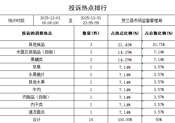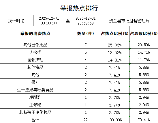 截至2025年12月31日,贺兰县市场监督管理局通过12315、12345、办公电话、微博、信函等途径共受理各类消费者投诉举报844件(其中投诉741件,举报84件,咨询建议求助19件,表扬0件),较上月增加134件,2024年12月共受理727件,同比上涨16.09%。已办结662件,办结率78.43%,书信51件,微博0件。