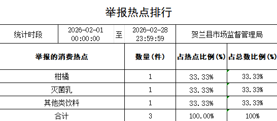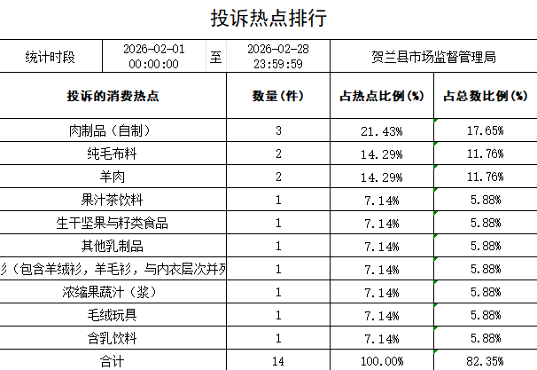 截至2026年2月28日,贺兰县市场监督管理局通过12315、12345、办公电话、微博、信函等途径共受理各类消费者投诉举报658件(其中投诉612件,举报38件,咨询建议求助7件,表扬1件),较上月减少157件,2025年2月共受理632件,同比上涨3.9%。已办结501件,办结率76.13%,书信27件,微博0件。