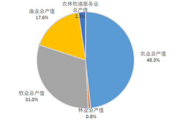 农林牧渔业分行业产值比重呈现“三升两降”态势。其中牧业总产值占农林牧渔业总产值比重为31.0%、渔业占比为17.6%,林业占比为0.8%,占比较上年同期分别增加1.0、1.8、0.1个百分点;农业、农林牧渔服务业占比较去年同期仍略有下降,占比分别为48.3%、2.3%,较去年同期分别减少2.7、0.2个百分点。