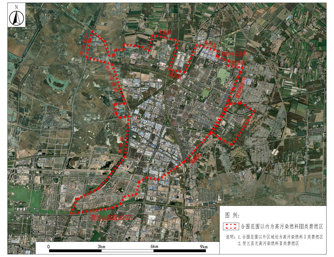 (一)贺兰县建成区东至银新沟-第四排水沟、南至贺兰山东路-贺兰县辖区边界、西至唐徕渠-第二农场渠-正源北街、北至北辰路-园艺路-水产路-创业路范围以内区域,划为高污染燃料Ⅲ类禁燃区;合围范围以外区域划为高污染燃料Ⅰ类禁燃区。